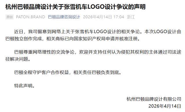 IT之家 4 月 15 日消息,杭州巴顿品牌设计有限公司 4 月 14 日发布关于张雪机车 LOGO 设计争议的声明: