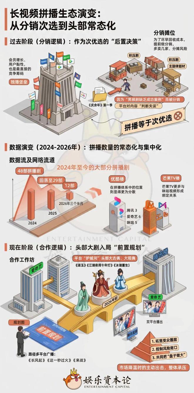 从分销逻辑到合作逻辑,拼播正在经历一次本质的变化。娱乐资本论(id:yuelezibenlun)与一些制片人、发行者也共同探讨了一下这种变化背后的原因,为什么平台开始愿意把好剧拿出来一起播?拼播项目为什么在向头部剧偏移?以及当头部内容也进入拼播体系后,平台之间、平台与片方之间,又在发生怎样的变化。