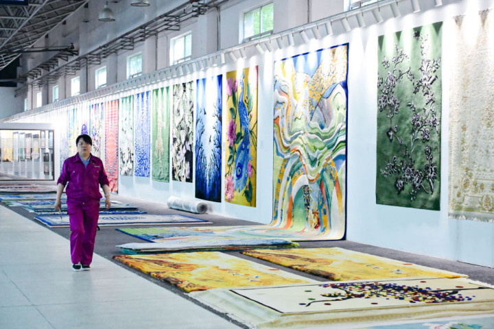 7月21日,圣源地毯集团有限公司车间内展示的各类挂毯。新华社记者 齐芷玥 摄