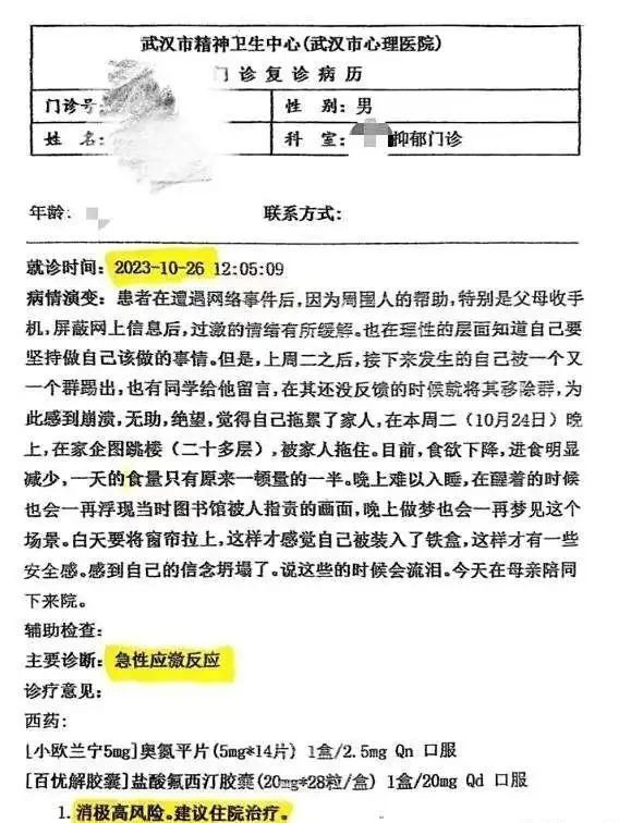 尽管法院给出了判断,但经过此番舆论纷争,肖某某的私人信息被“开盒”曝光,同学孤立他、陌生人谩骂他。2023年10月17日,他在武汉市精神卫生中心被确诊为“急性应激反应”;两个月后,诊断升级为“创伤后应激障碍,自杀或自残倾向高达80%”。