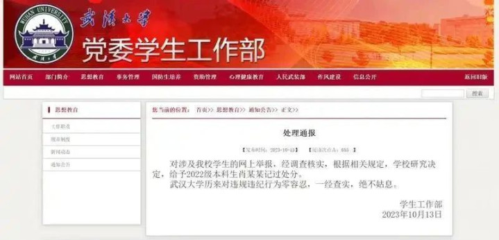 该女生发文维权两天后点点金,武大发布通报给予肖某某记过处分,认定“肖某某在图书馆北门走廊存在不雅行为”。