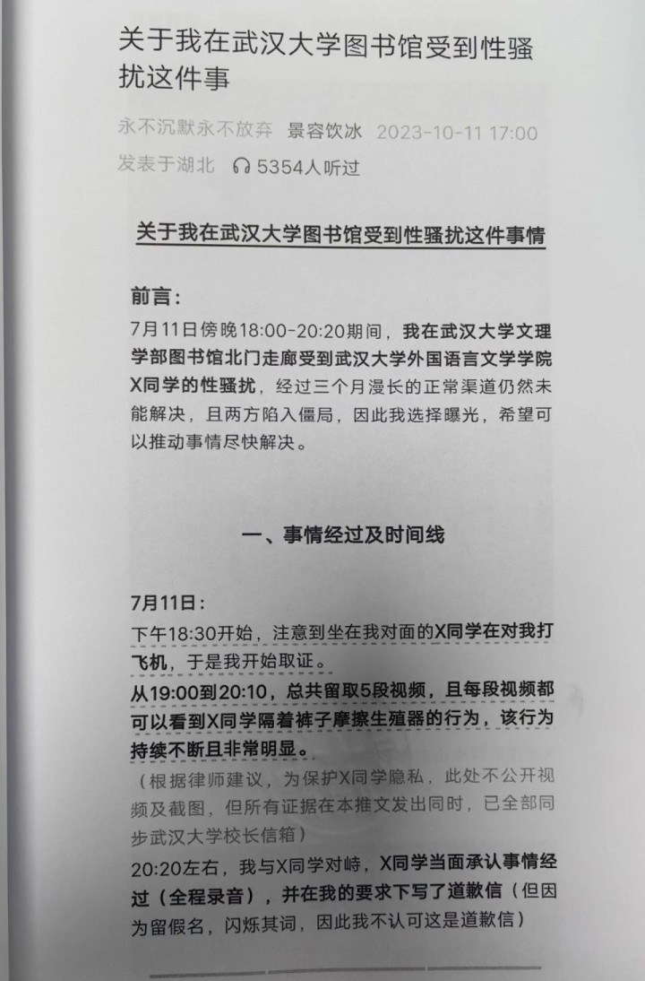 这起事件并不复杂。起因是,2023年10月11日,武汉大学女生杨某发文称,在图书馆自习时被肖某某“性骚扰”。