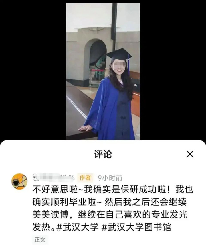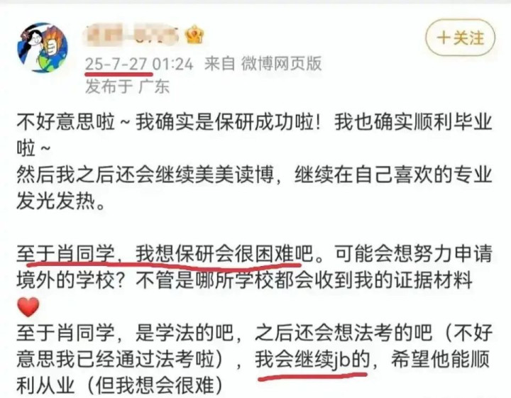 法院判决后,7月27日,疑似杨某的账号在网上发文,称要继续举报,还透露自己已通过法考,保研成功。