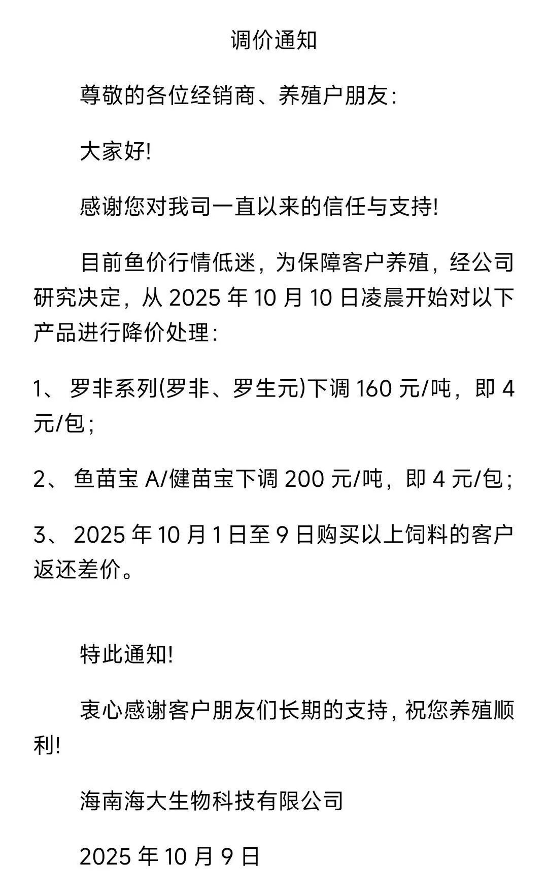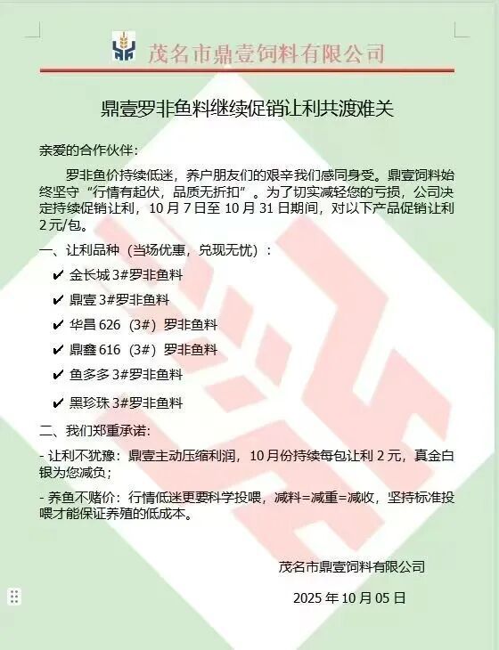 与行业共克时艰,饲料企业率先“割肉”救市。海大生物10月10日起把罗非鱼饲料直降4元/包(或160元/吨);10月1-9日购买公告上产品的客户可返还差价。而茂名市鼎壹饲料有限公司则宣布,凡在10月7日至31日购买公司公告上的产品,让利2元/包。